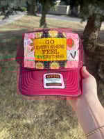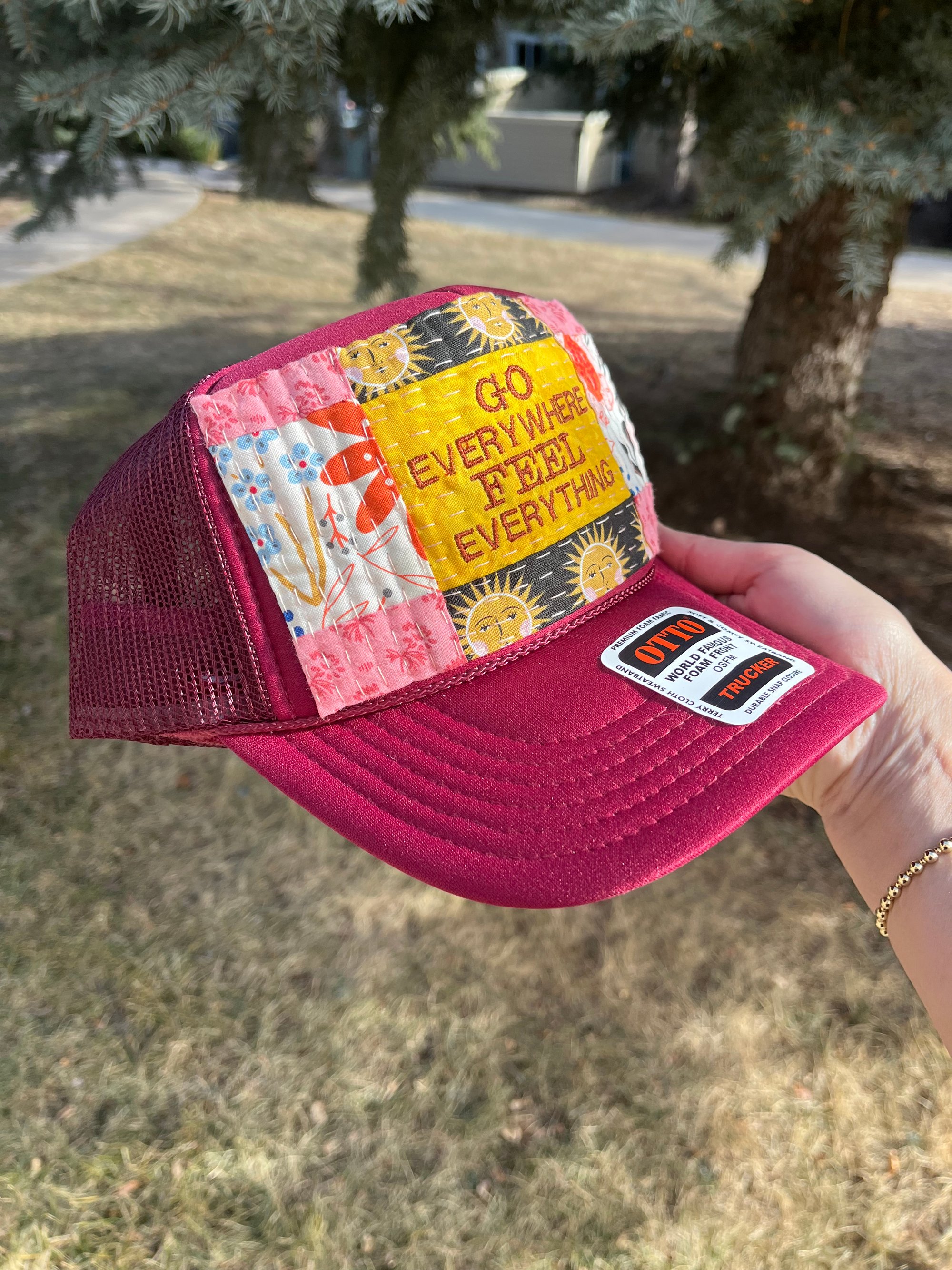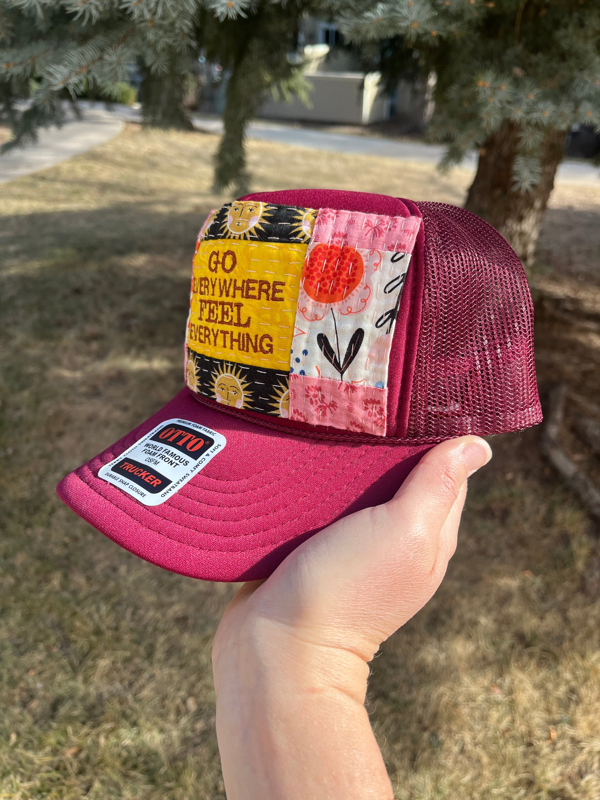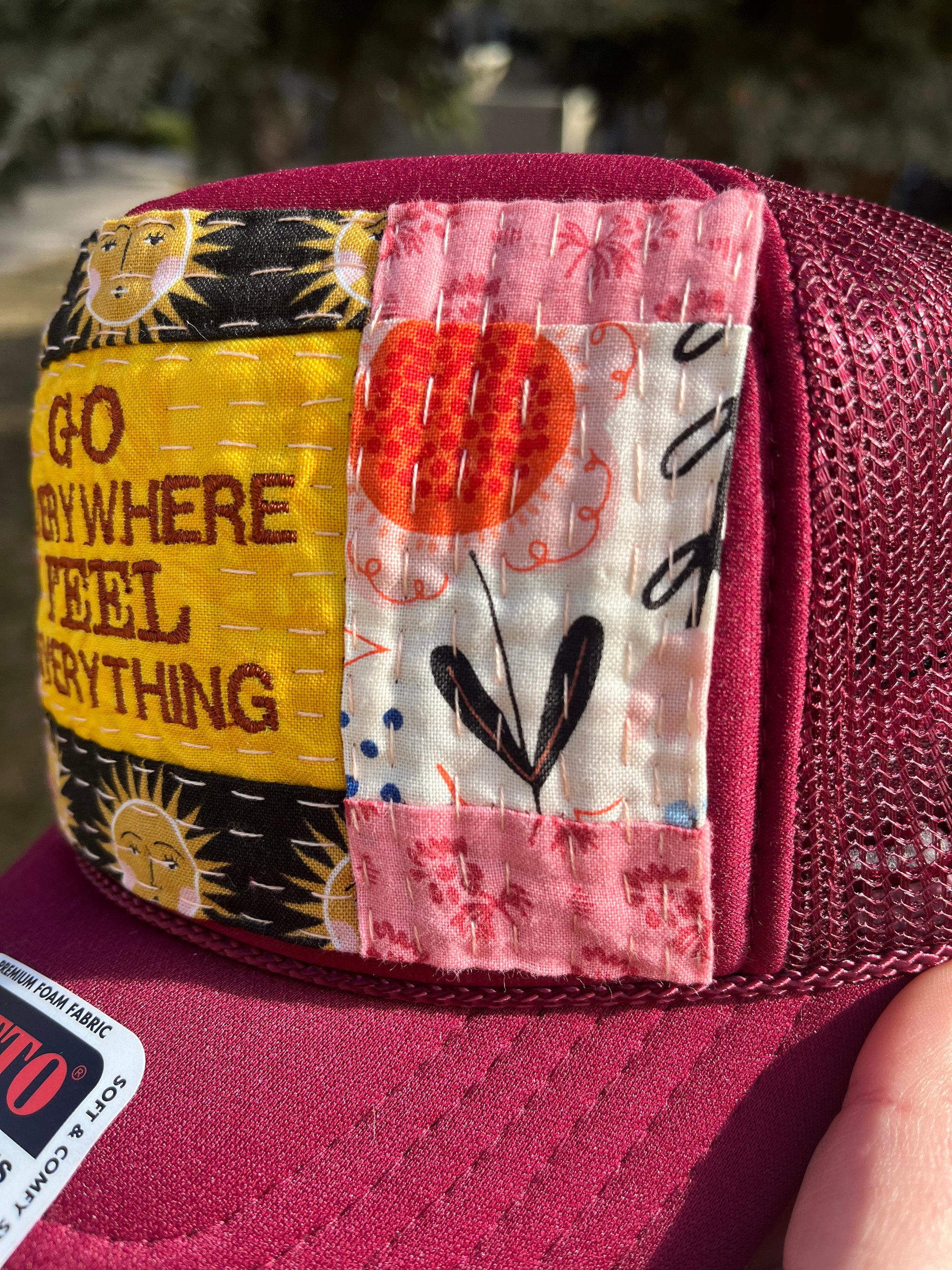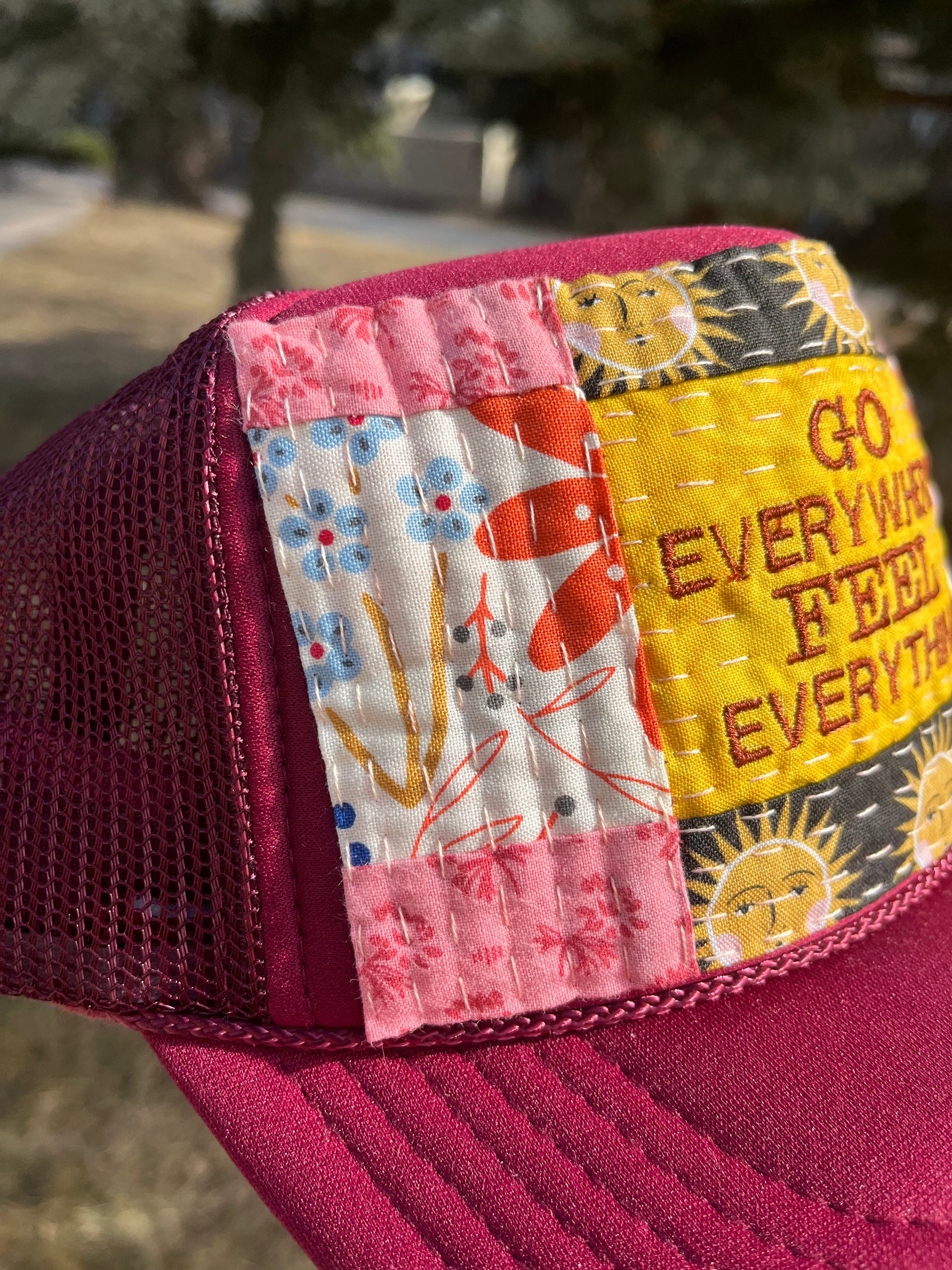 GO EVERYWHERE FEEL EVERYTHING embroidered in a copper brown on a deep yellow marbled print fabric. Above and below is a sun print. On each vertical side is a white, blue and coral floral print and in the corners is a pink paisley botanical print.
