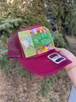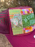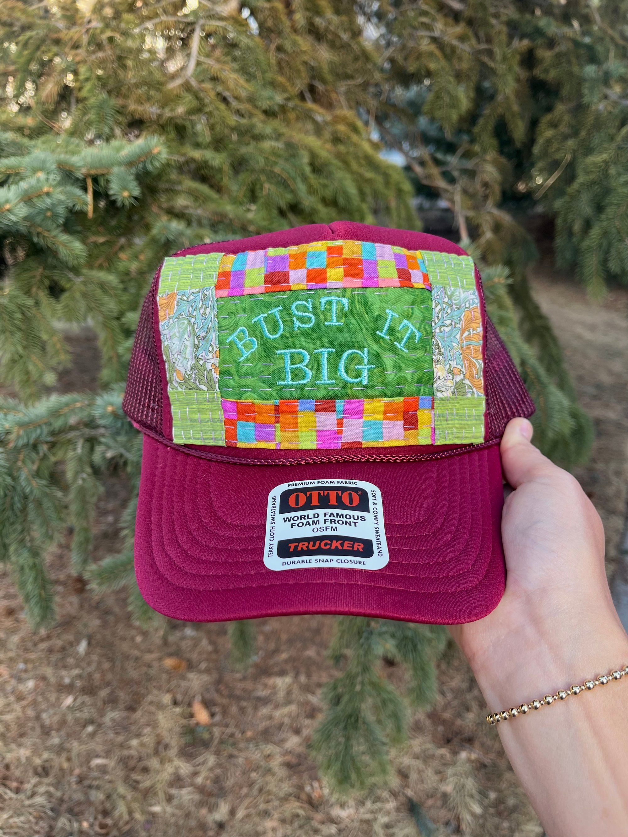 Bust It Big embroidered on, sky blue text on a marbled green fabric background. Patch is stitched onto a burgundy/maroon Otto brand foam trucker hat with a SnapBack closure for an adjustable fit - yes, even fits the big noggin folks! Above and below the embroidery is a multi color checkered print, it reminds me of a colorful disco ball! On each side is a botanical paisley print and in the corners is a green on green thin stripe pattern. Handquilted in 100% hand dyed cotton thread, in the color Amethyst.
