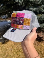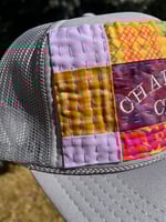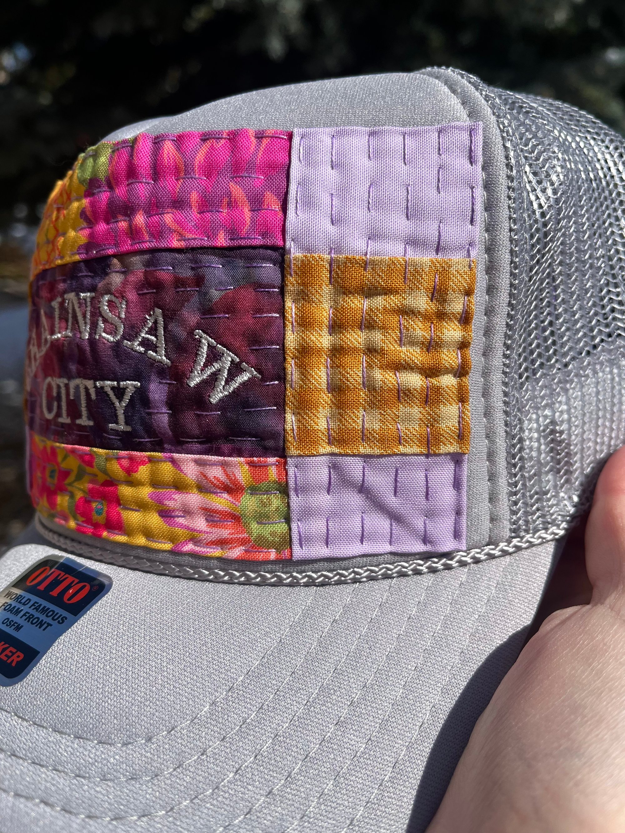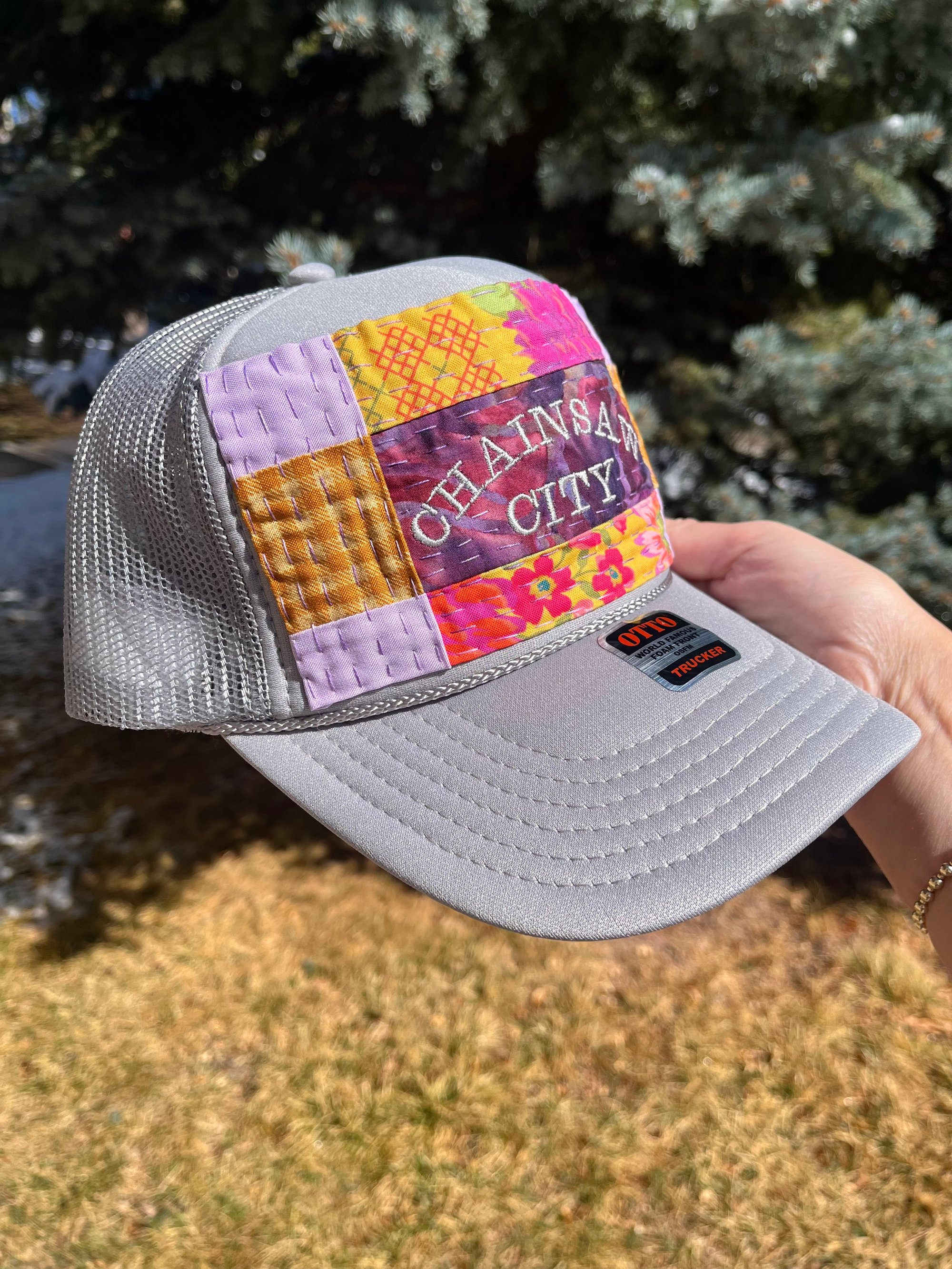 Chainsaw City hat stitched in silver on a deep purple batik dyed fabric that sits atop a grey Otto brand foam trucker with a SnapBack closure for an adjustable fit.