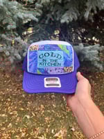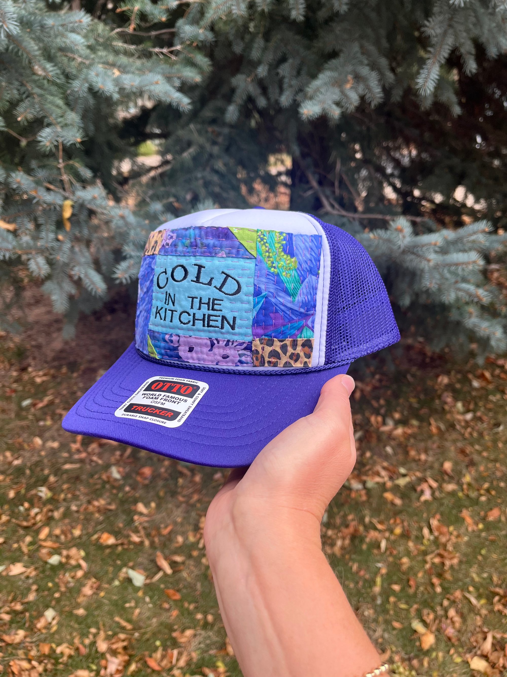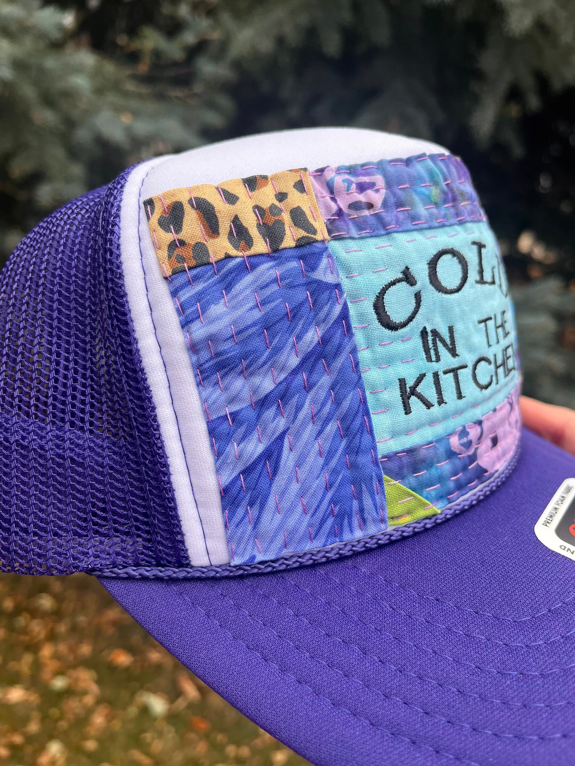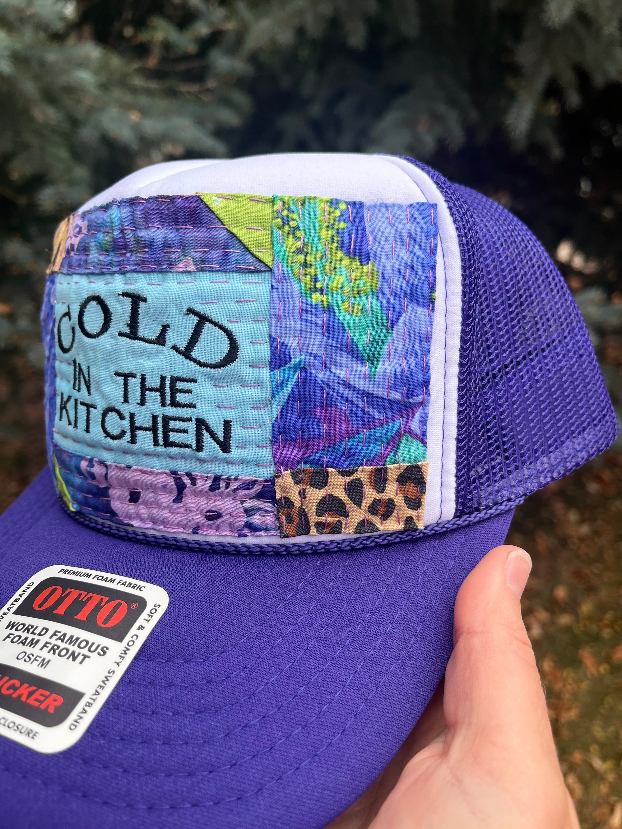 Cold in the Kitchen is machine embroidered onto a light blue patch. Above and below is a batik purple and violet floral print with small green triangles in each corner.