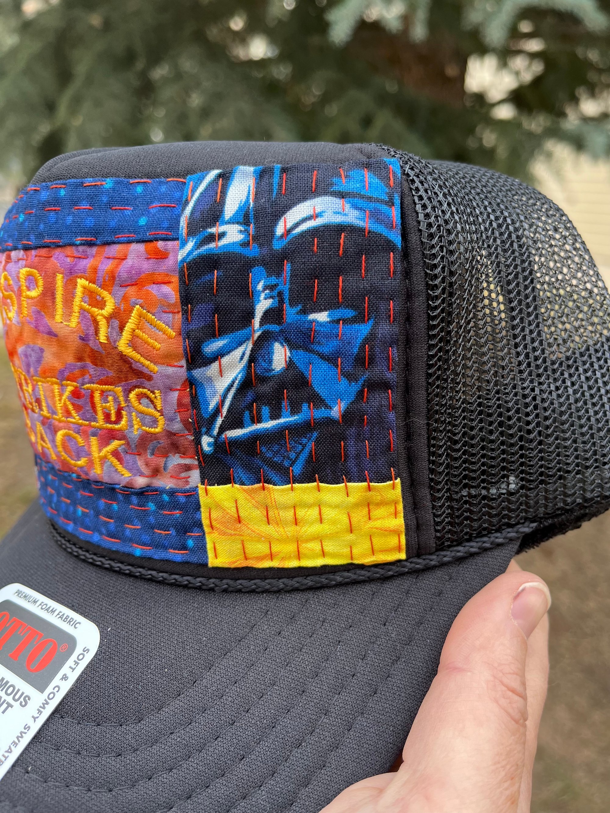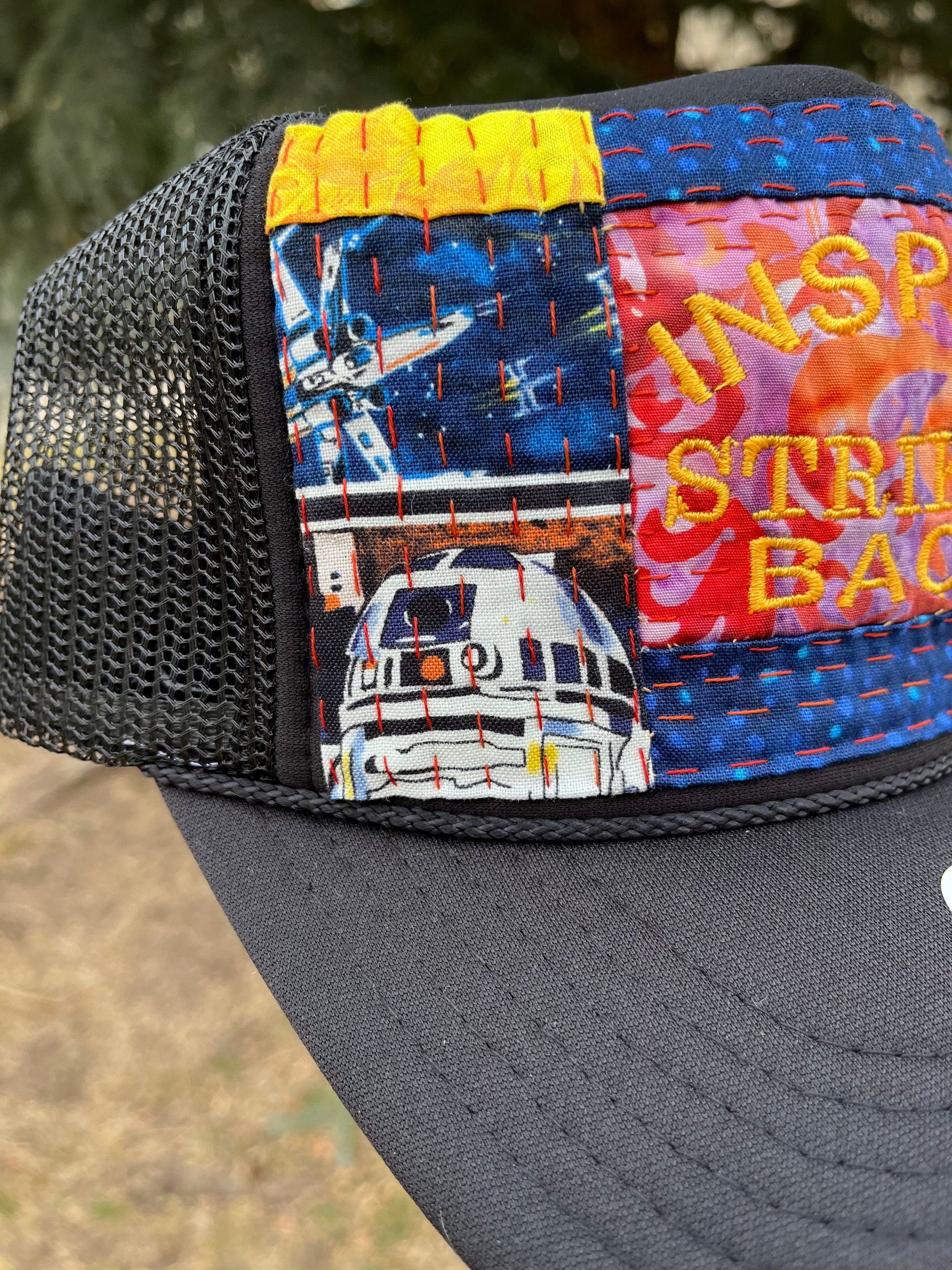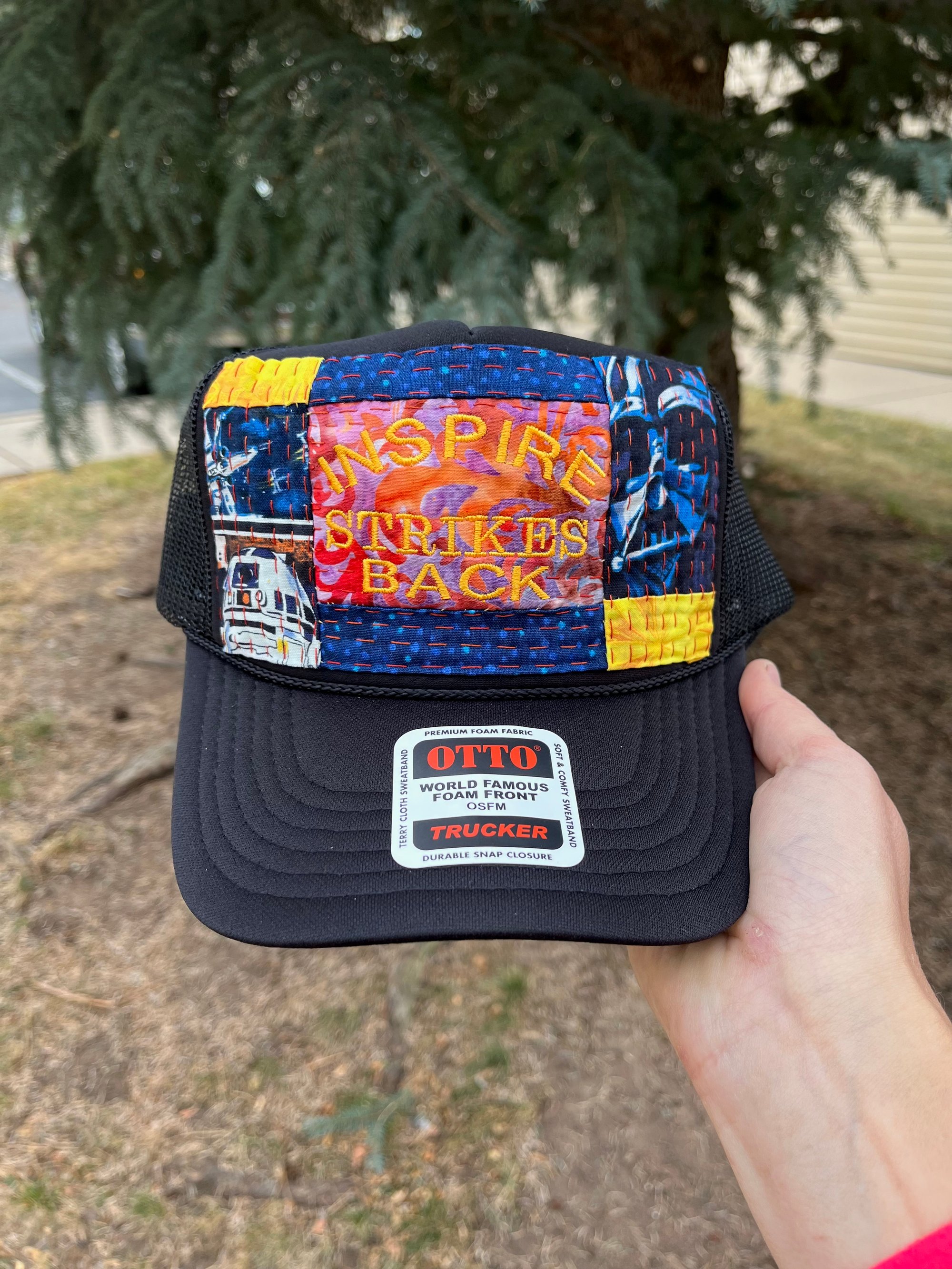 One of a kind INSPIRE STRIKES BACK hat on a black Otto brand foam trucker with a SnapBack closure for an adjustable fit. Yes, even fits the big noggin’ folks!