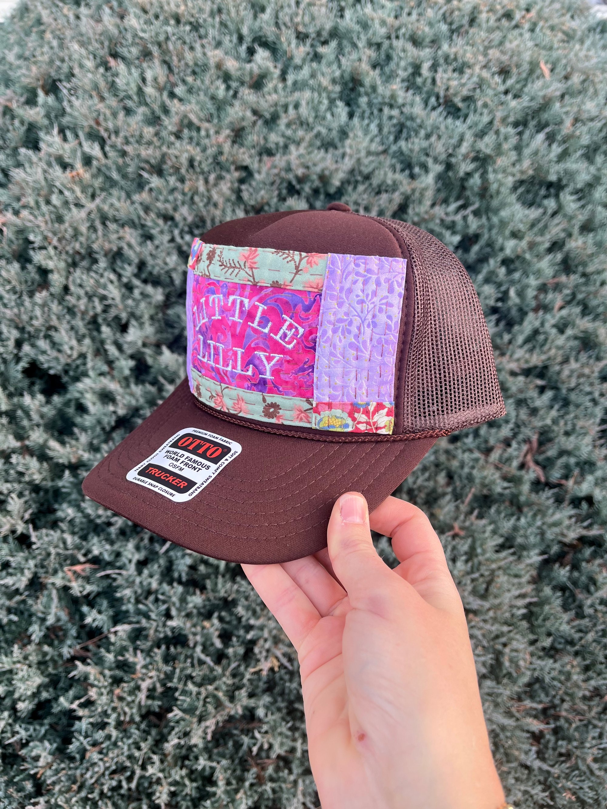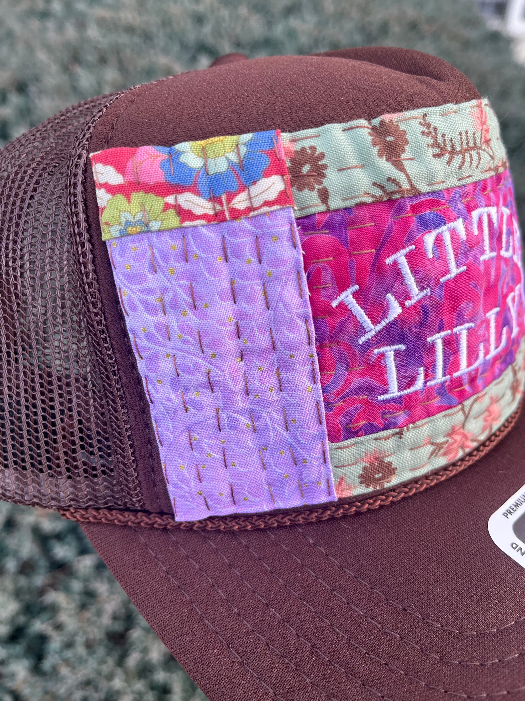 Little Lilly is embroidered in white on a pink and purple traditional batik print. Above and below is a sea foam green with pink and brown botanicals. On each vertical side is a lavender and gold metallic print. In the corners is a darker pink and blue floral.