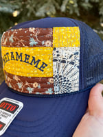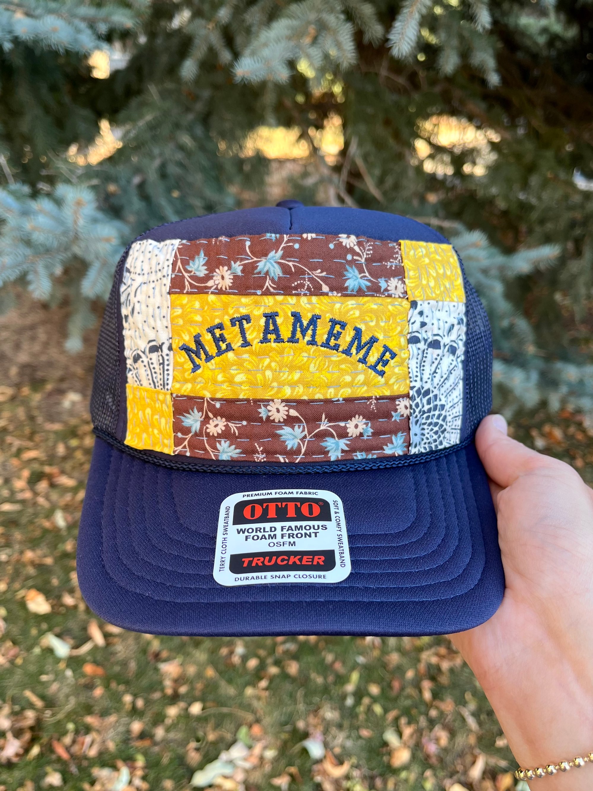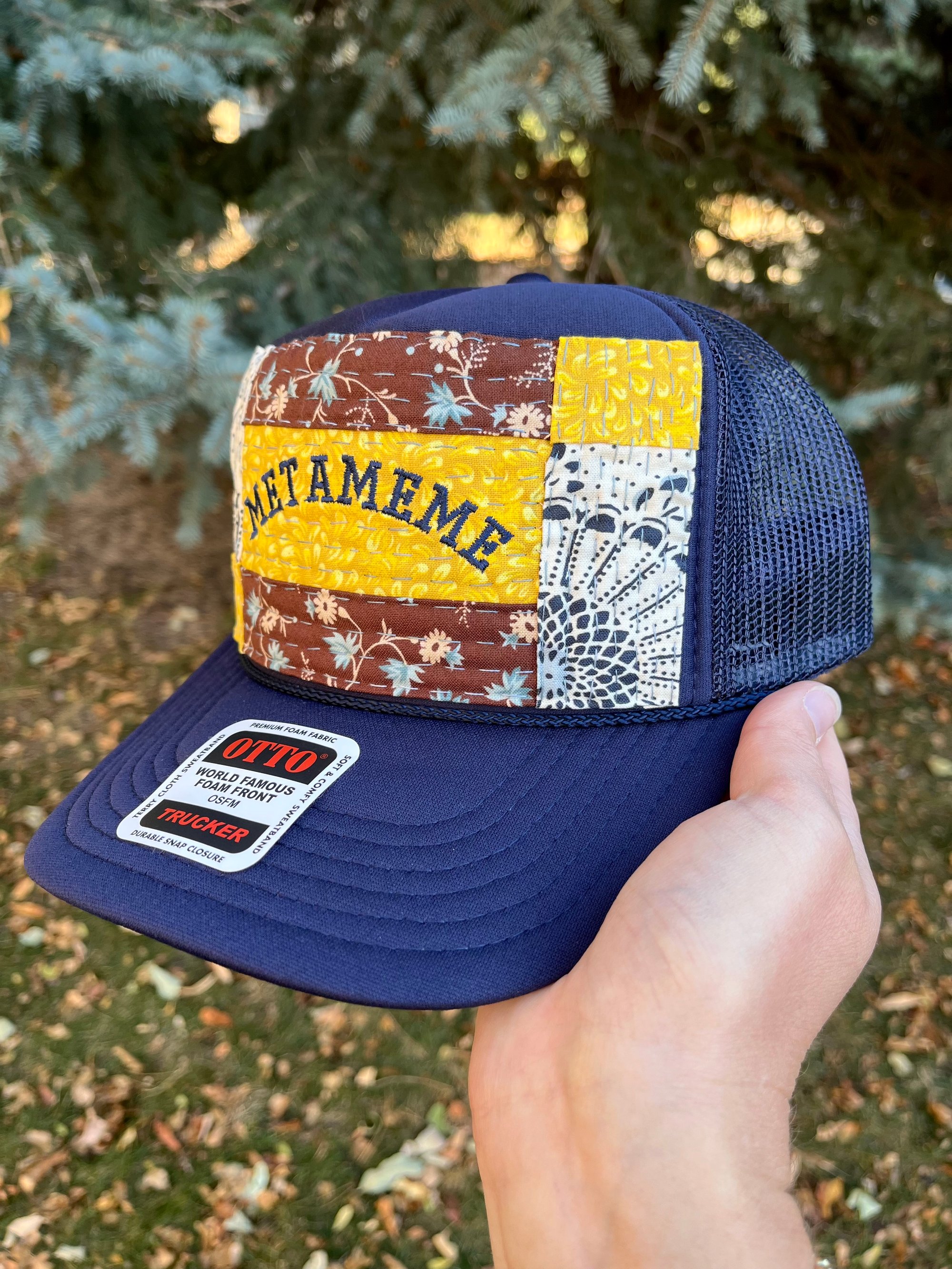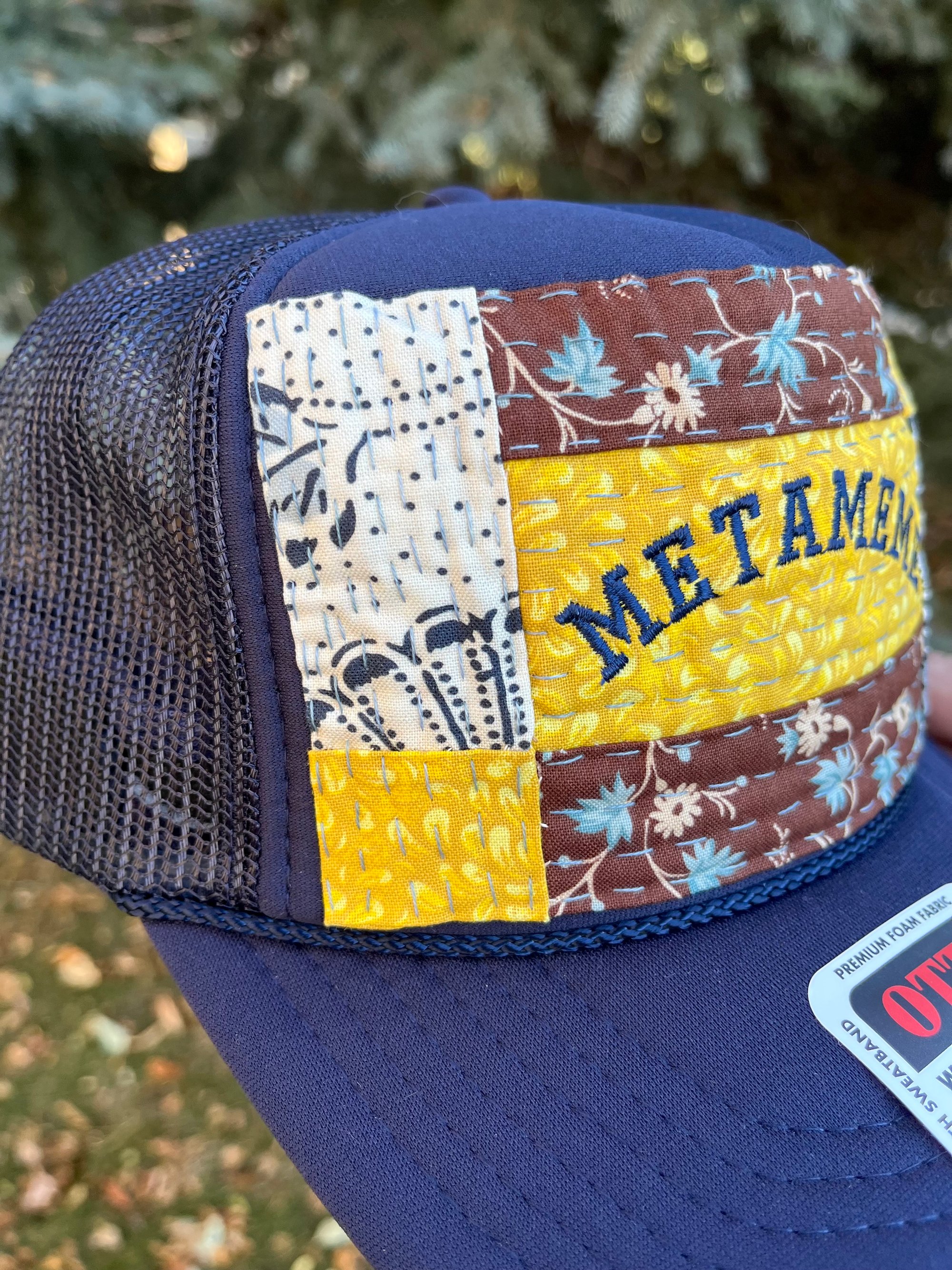 Navy Otto brand foam trucker with METAMEME embroidery in navy. Embroidery is on top of a yellow patch with brown and blue florals above and below. On each vertical side is a white and navy henna styled pattern with matching yellow in the corners. Handquilted in 100% hand dyed cotton thread color titled Deep Blue Sea. Hat has a SnapBack closure for an adjustable fit, yes, it even fits the big noggin’ folks!