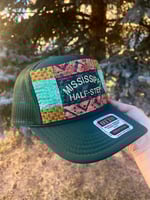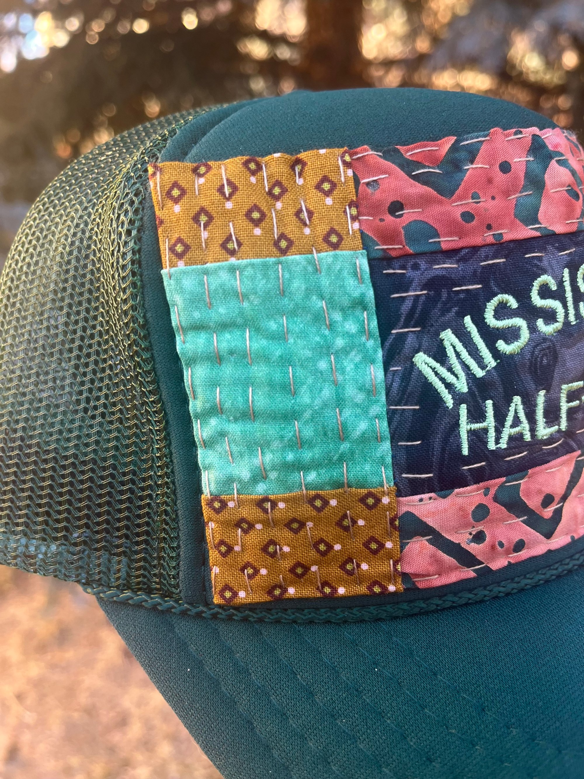 Mississippi Half-Step handquilted hat on a forest green Otto brand foam trucker with a SnapBack closure for an adjustable fit. Yes, even fits the big noggin’ folks!