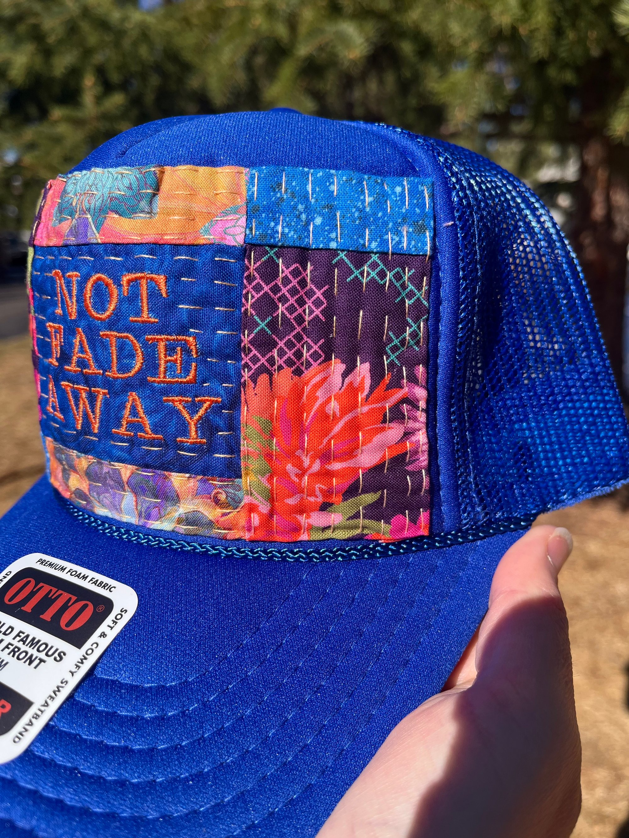 NOT FADE AWAY machine embroidered in orange on a royal blue paisley print fabric. Above and below is a coral, peach, blue large scale mandala print fabric. On each vertical side is a deep purple with bright colored florals and botanicals. In the two corners is a blue spray paint print fabric.