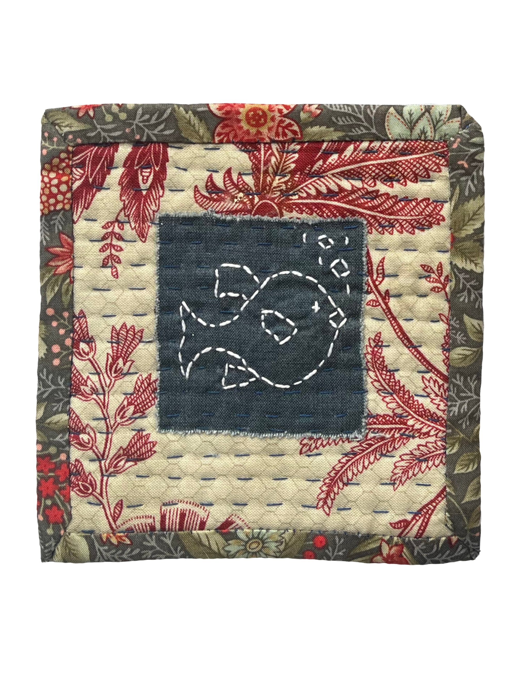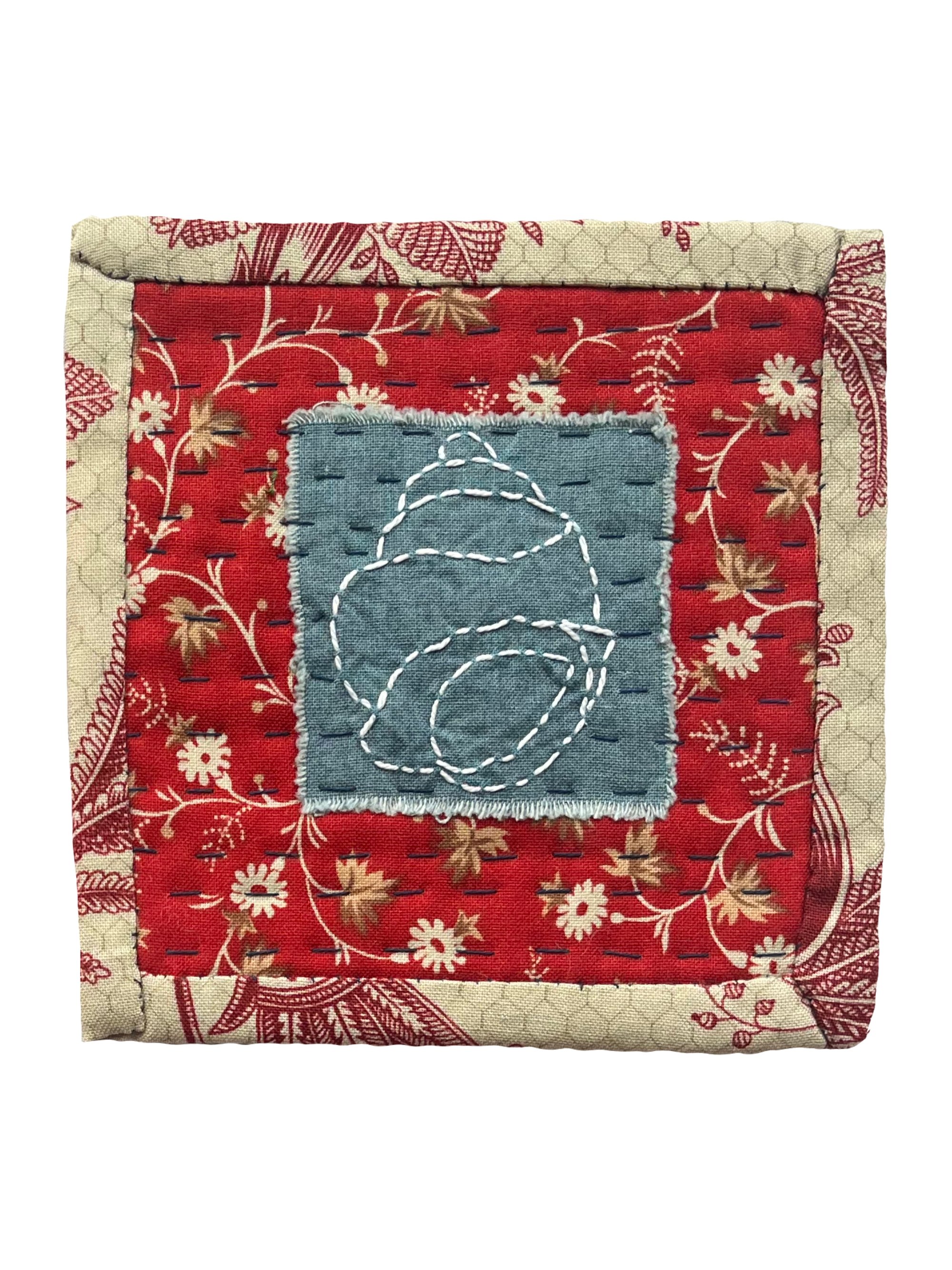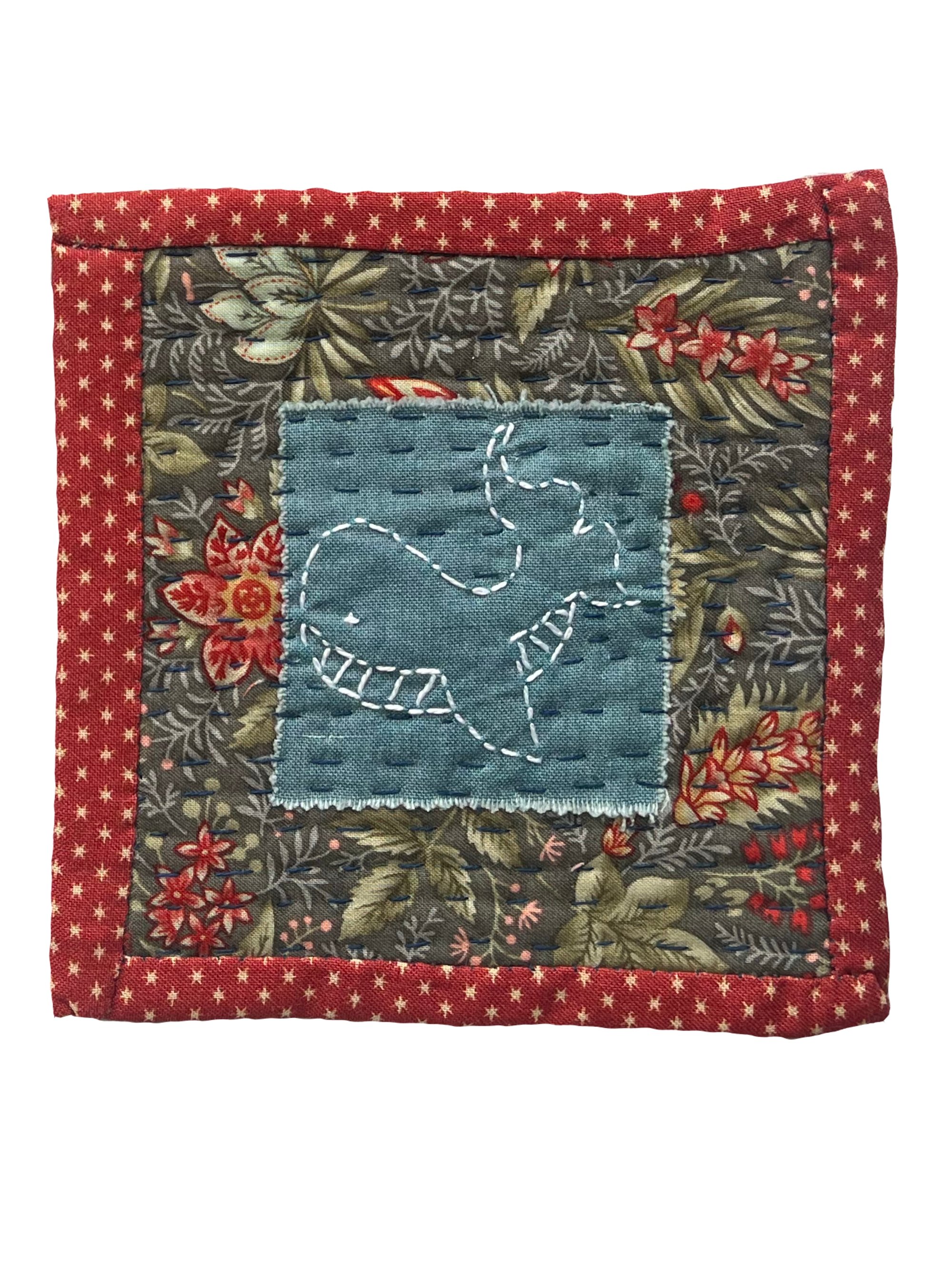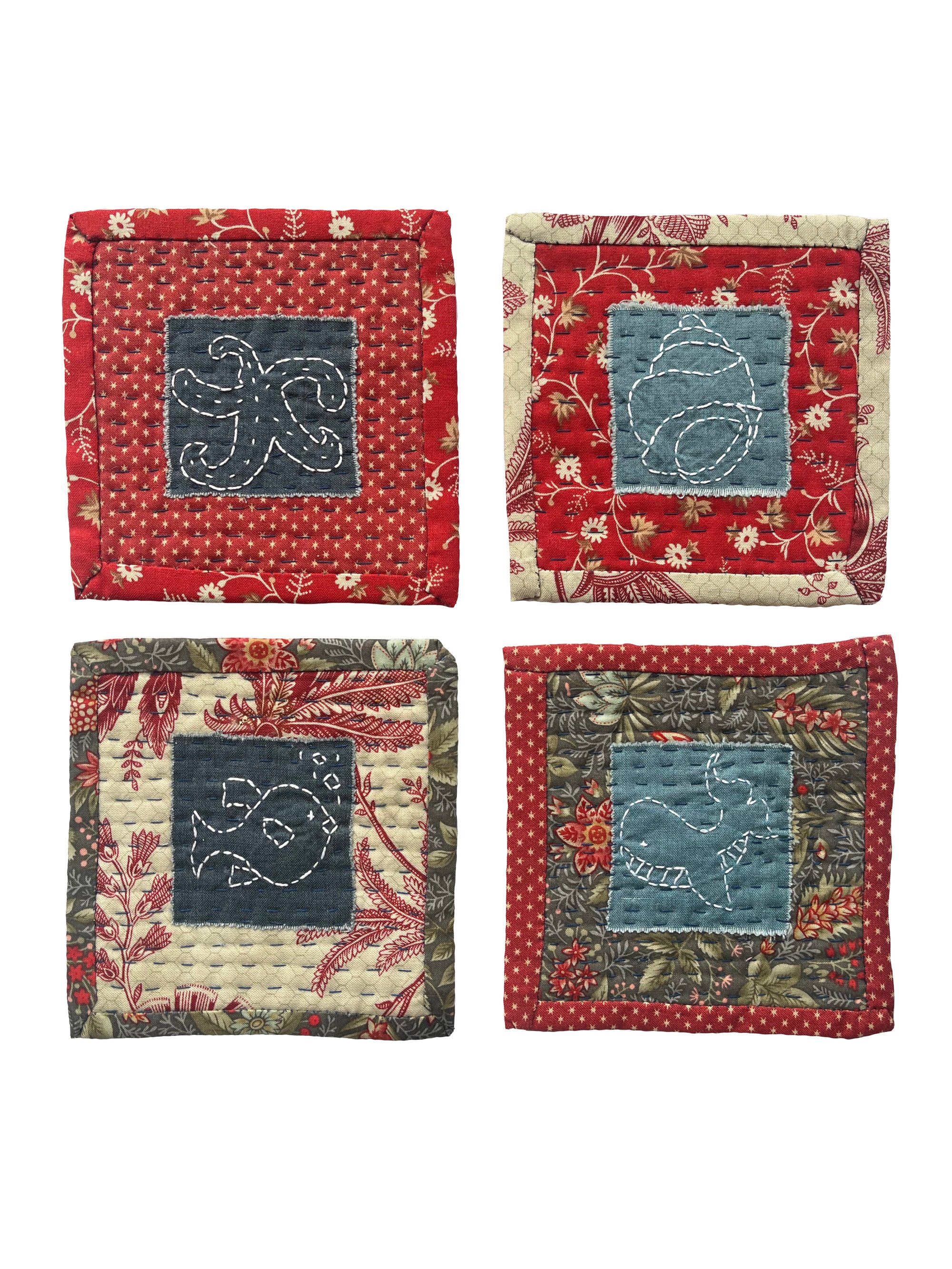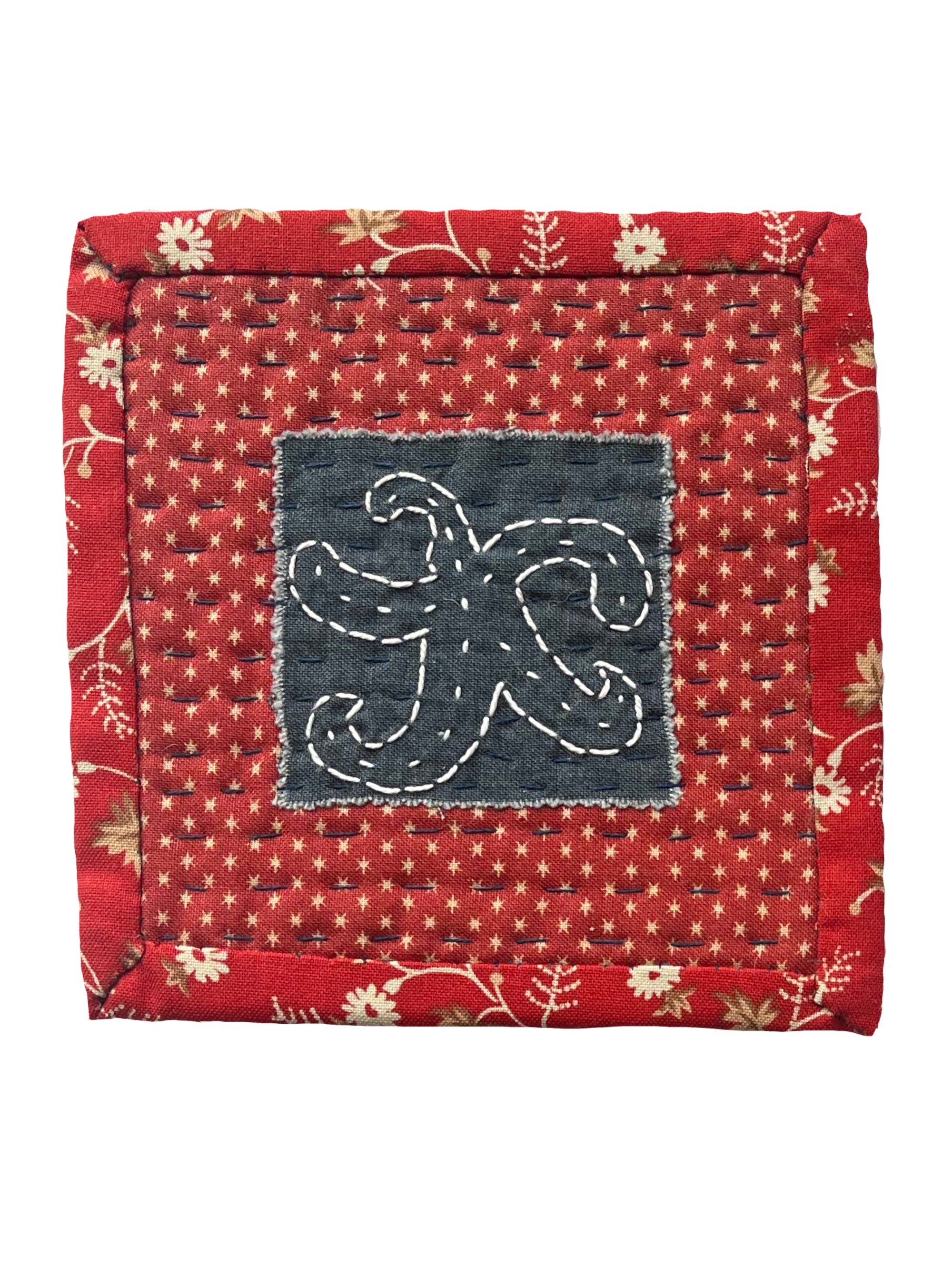 Each Coaster is hand quilted in navy thread. The coasters measure 5 x 5 inches.