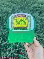 The centerpiece patch is truly unique: Sigma Oasis is embroidered in green thread that perfectly matches the hat’s brim, set against a vibrant yellow background fabric. Flanking the text are green striped panels, with rich brown patterned fabrics layered above and below creating a textured, earthy feel.