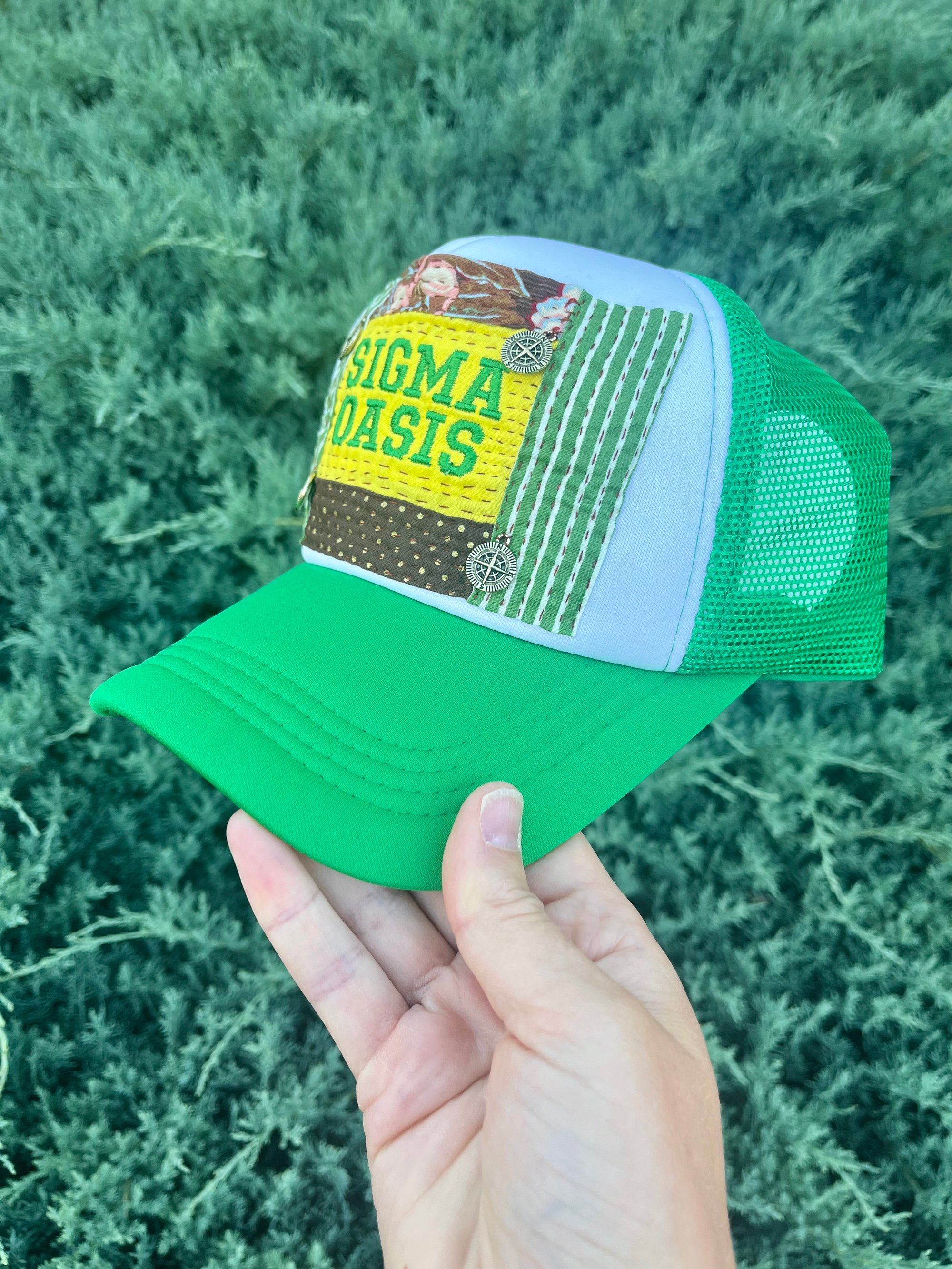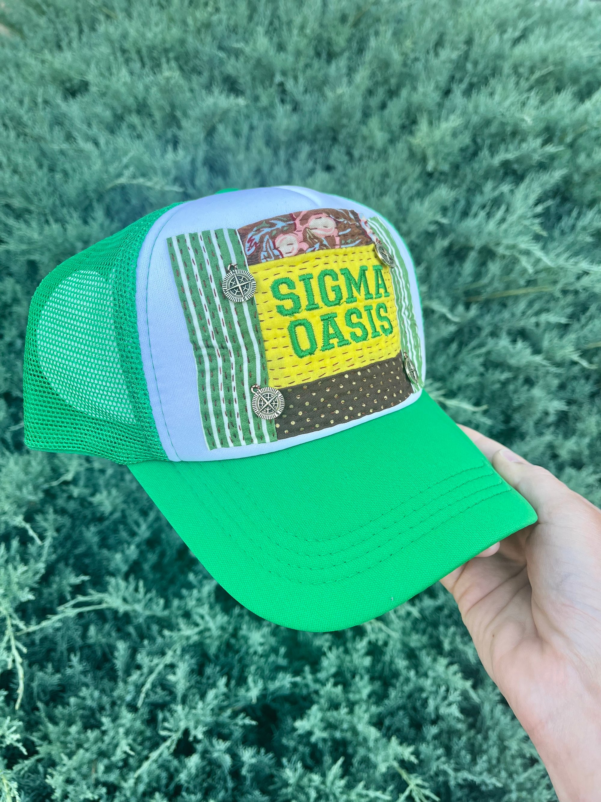 Inspired by the Phish song Sigma Oasis, this one-of-a-kind hand quilted trucker hat is built on a vibrant kelly green foam trucker with a classic snapback closure for an easy, adjustable fit.