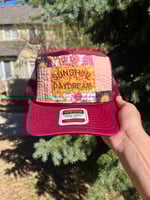 SUNSHINE DAYDREAM embroidered in a copper brown on top of a yellow and orange vintage wallpaper-esque fabric.