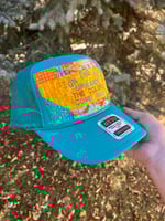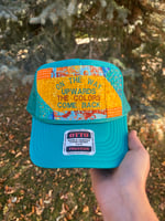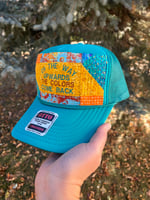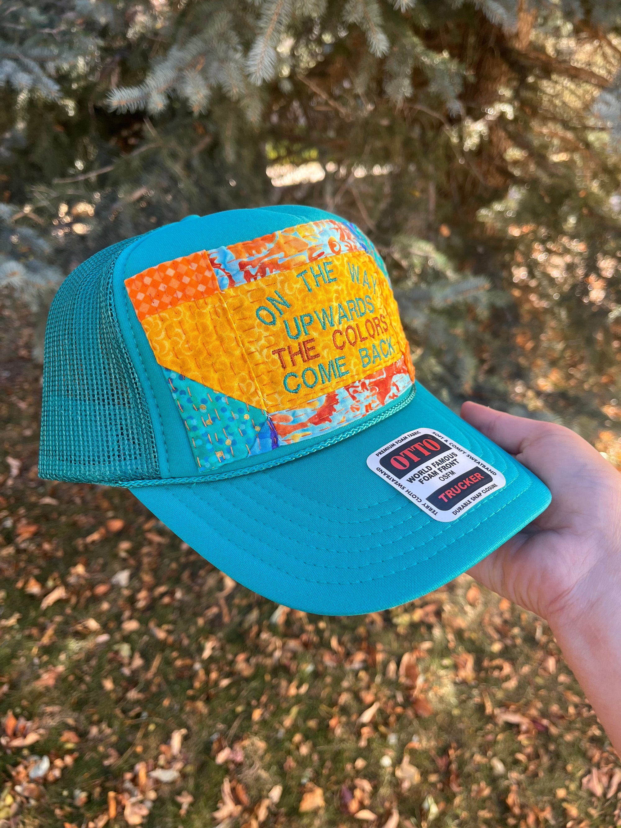 Turquoise hat with yellow patchwork reading ON THE WAY UPWARDS THE COLORS COME BACK in turquoise and burnt orange embroidery.