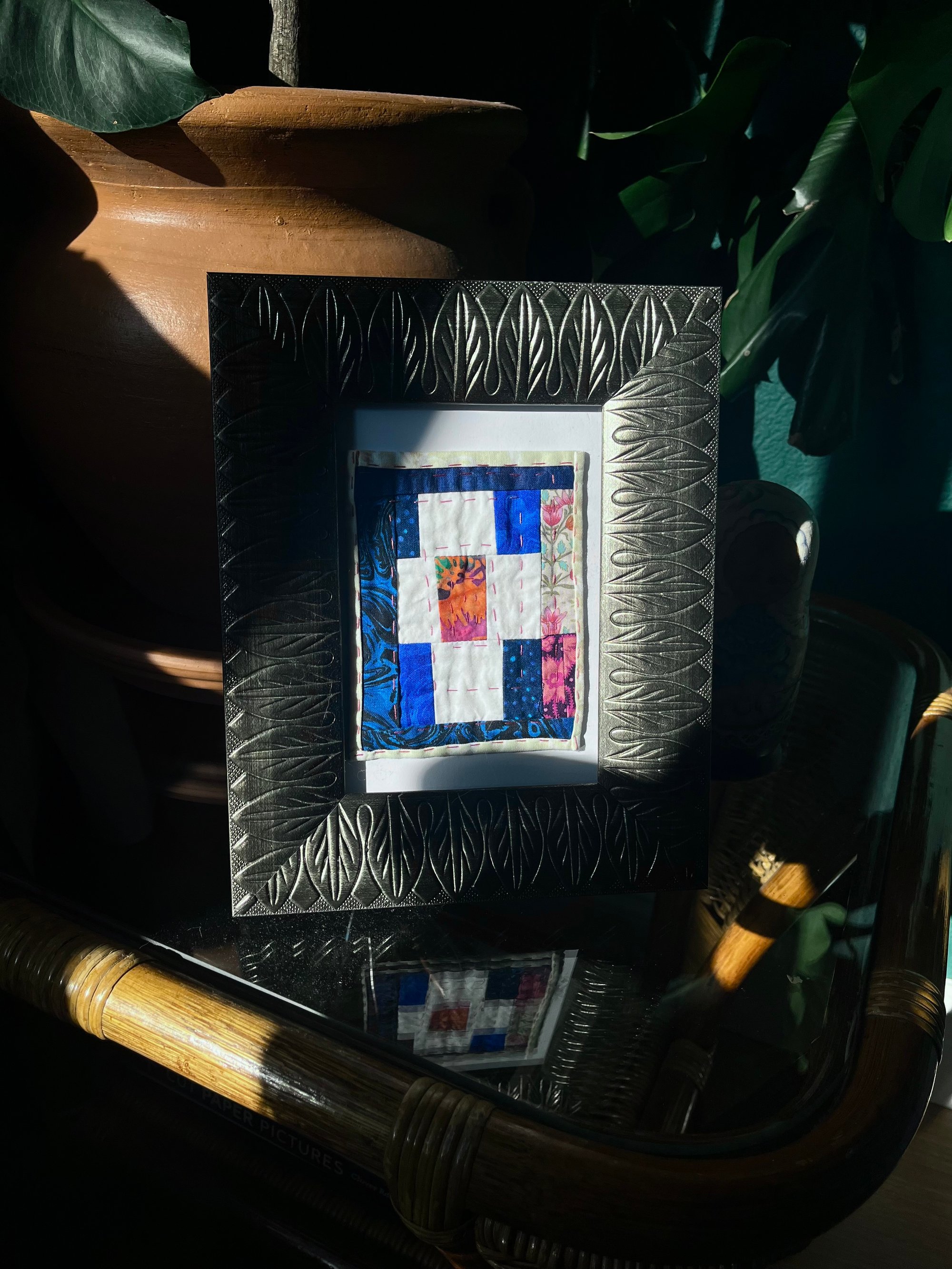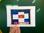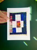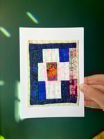 The Tiny Quilt is mounted to a white, 5 x 7 inch matte board and will come in a clear sleeve. I have signed and numbered the Tiny Quilt on the back. The artist signature is on the back so that you may change the orientation of the piece in the way that speaks to you the most! The whole quilts attitude changes with a slight 90 degree turn!
