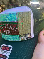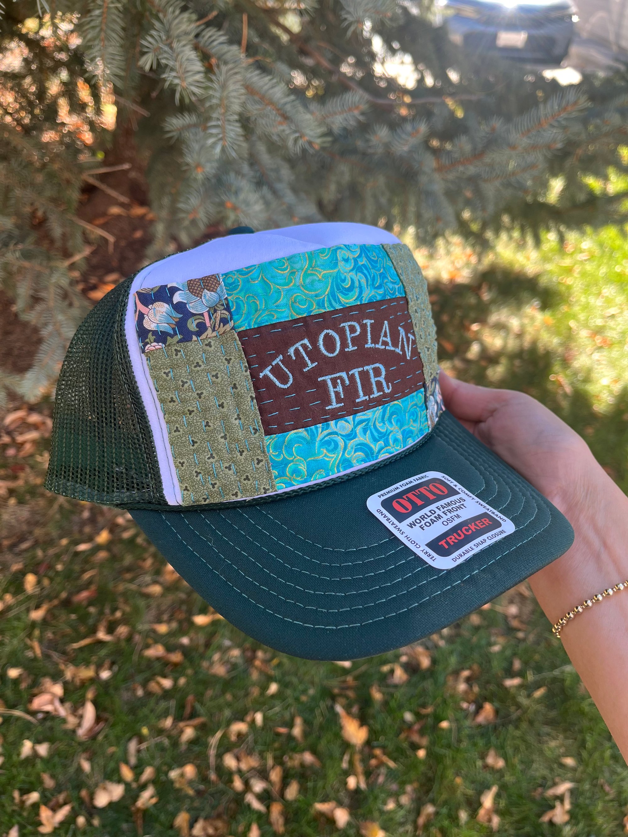 UTOPIAN FIR embroidered in a silvery blue on a brown patch. Above and below the patch is a teal and seal blue swirly fabric with gold metallic strokes. On each vertical side is a tone on tone green vintage pattern and in the corners is navy blue florals.